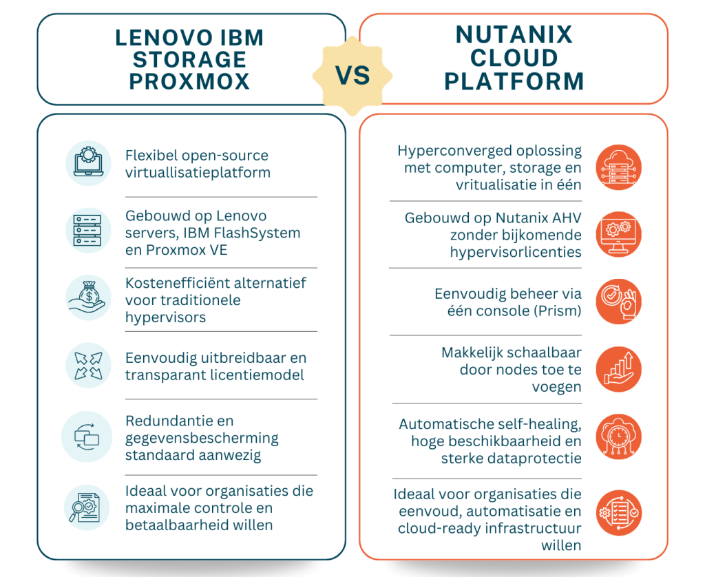 Of je nu kiest voor een flexibel, open virtualisatieplatform of voor een hyperconverged oplossing die alles samenbrengt: wij helpen je de juiste technologie te kiezen en ondersteunen je bij de implementatie en het beheer ervan, zodat je IT-omgeving naadloos kan groeien met je bedrijf. Onze oplossingen bieden je redundantie en ransomware bescherming, waardoor je verzekerd bent van minimale downtime en maximale beveiliging tegen moderne dreigingen.